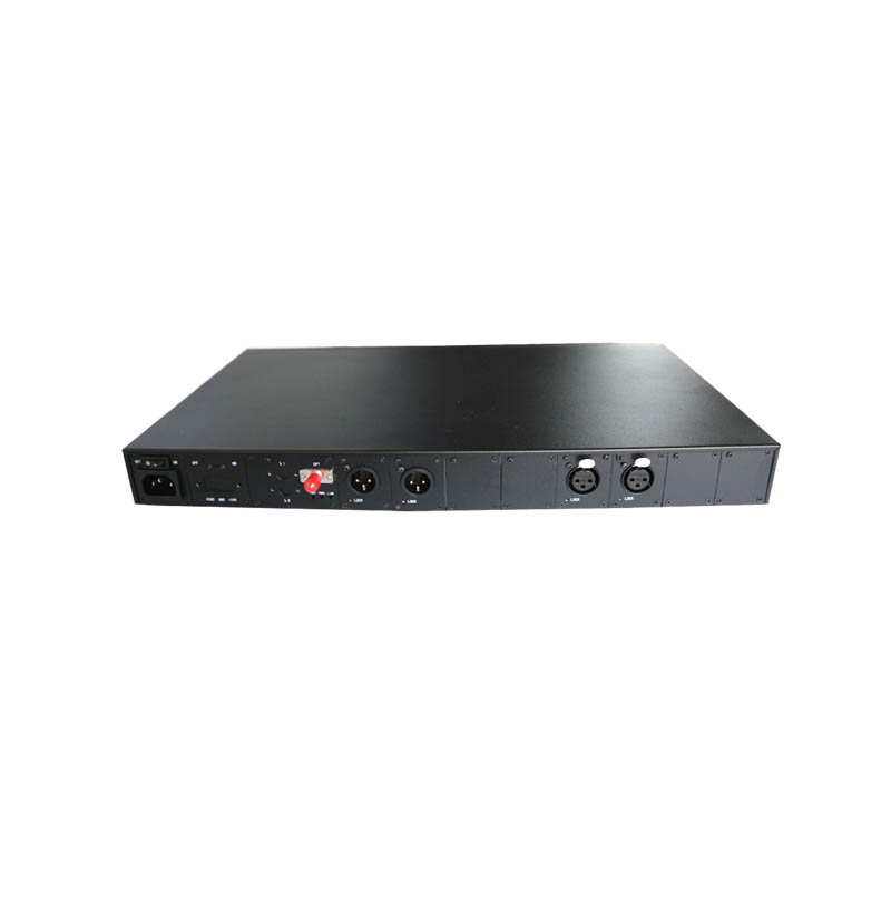 卡儂頭(XLR)音頻光端機(jī)是實(shí)現(xiàn)8聲道HIFI音頻在一根光纖上單向長(zhǎng)距離傳輸。設(shè)備采用專業(yè)級(jí)3XLR接口,將輸入的音頻信號(hào)轉(zhuǎn)換為數(shù)字信息,經(jīng)數(shù)字復(fù)用,再轉(zhuǎn)換為光信號(hào)進(jìn)行傳輸,在接收側(cè)完成光電轉(zhuǎn)換,并經(jīng)過(guò)解復(fù)用,數(shù)模變換還原為模擬信號(hào)輸出。